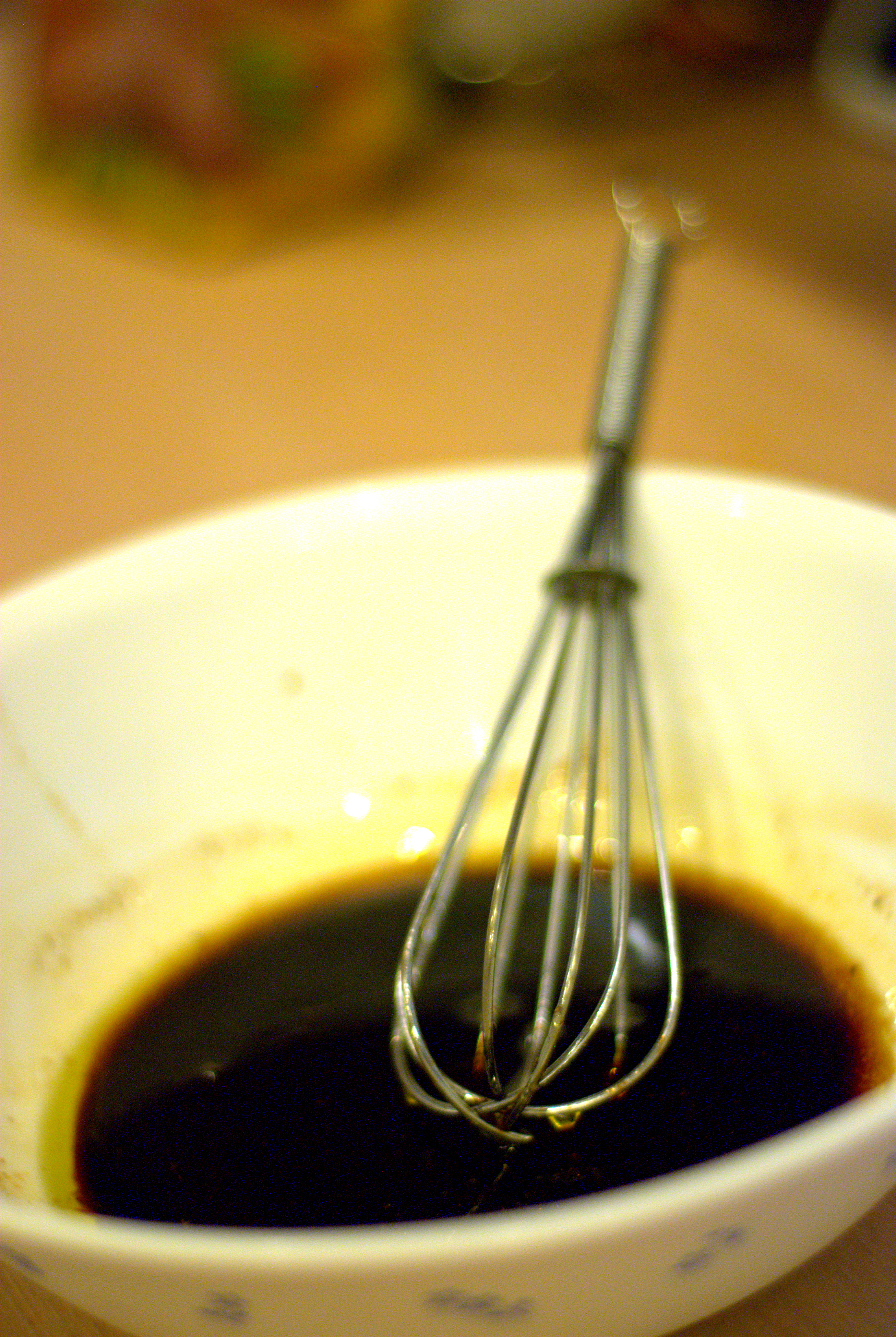In a separate bowl, whisk together the vinegar, honey, salt and pepper. Add the oil in a slow stream, whisking until well combined.