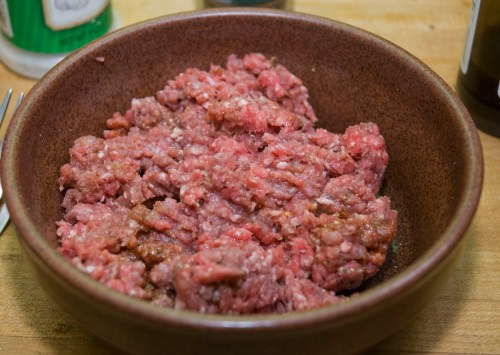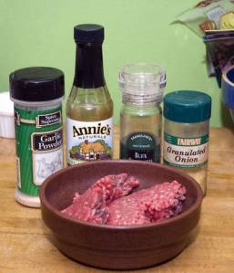 Combine the salt, pepper, onion and garlic powder in a large bowl. Add the Worcestershire sauce and meat to the of the spices. Mix until just combined – do not over mix.