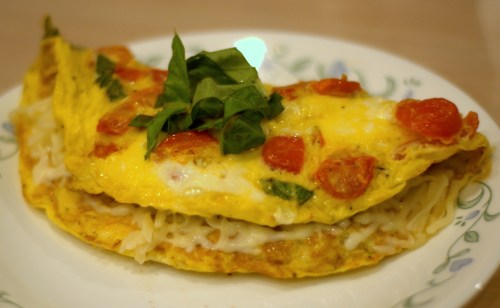 This omelet combines some of my favorite flavors – tomatoes, basil and mozzarella cheese. They are a great and classic combination. One day I decided to put them all into an omelet and this recipe was born!