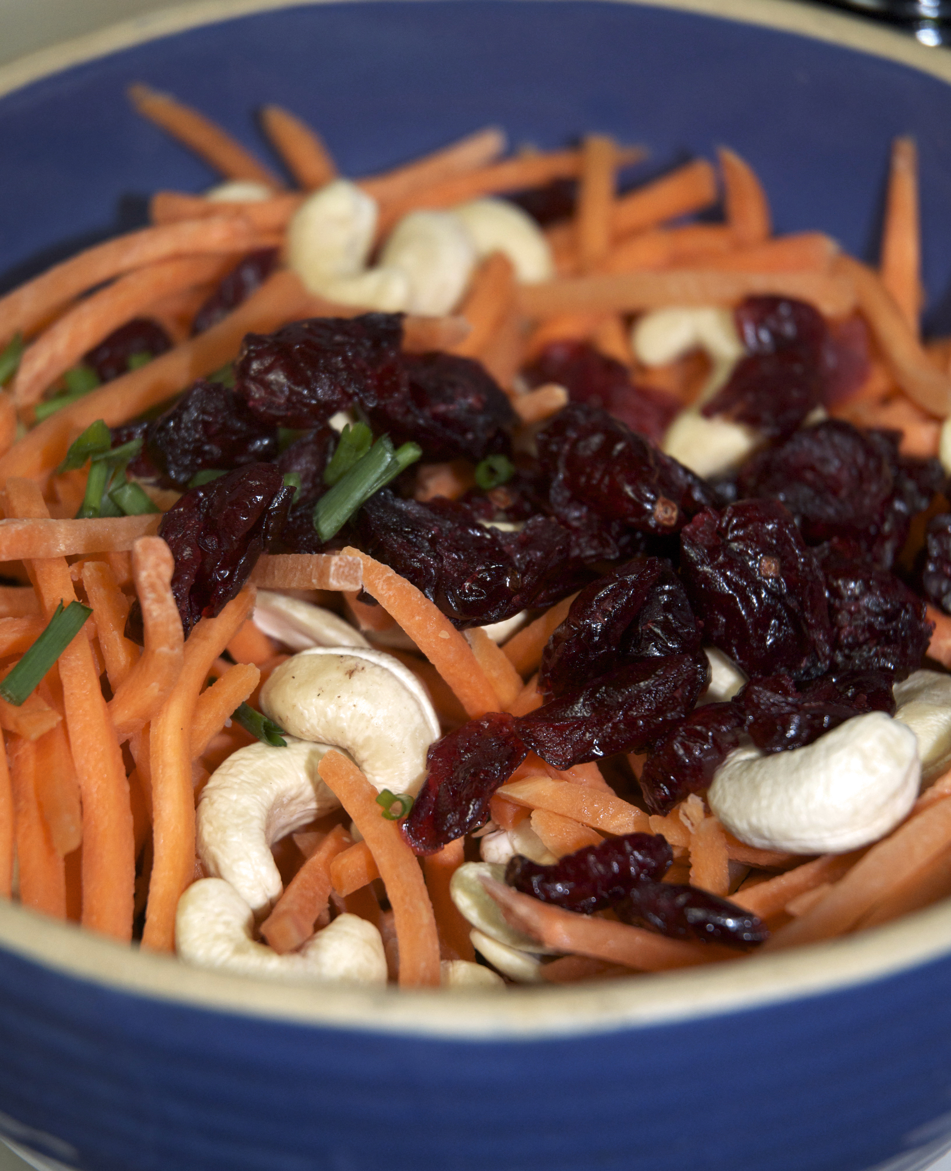 Place the carrots, nuts, cranberries and scallions into a large bowl.