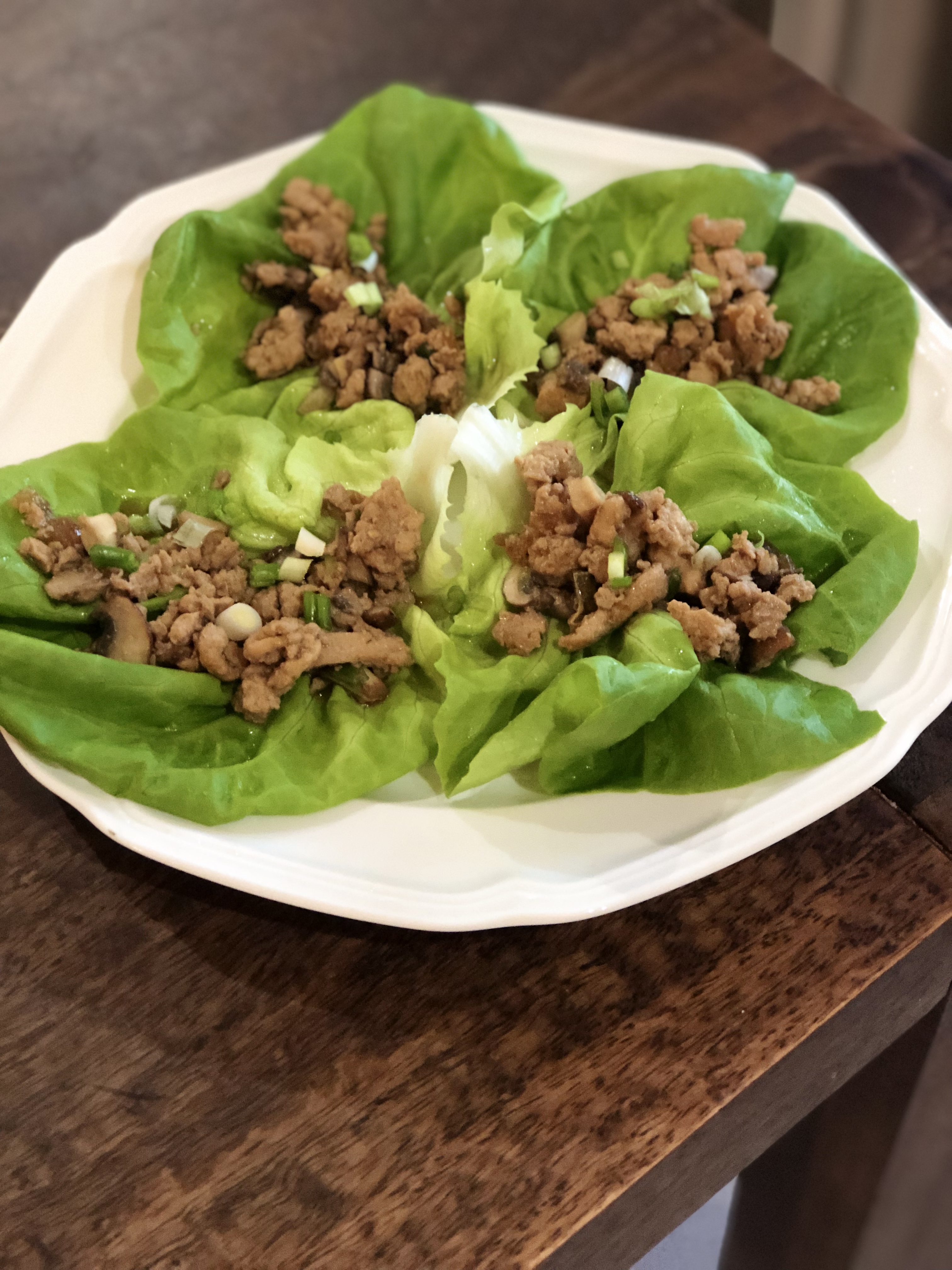 If your lettuce is wet you will want to pat it dry before serving (no one wants to eat a soggy lettuce wrap). Place a generous amount of the meat mixture in the middle of each lettuce leaf. Garnish with finely chopped scallions.