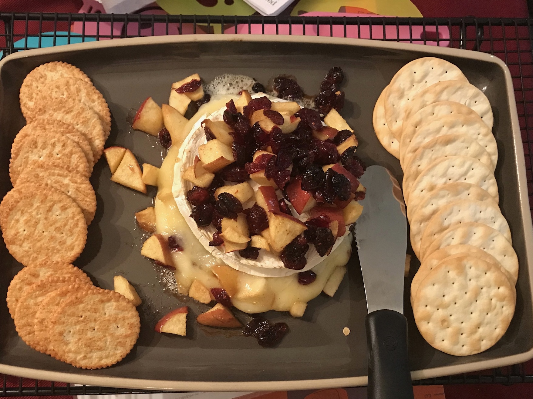 I love brie and always feel it makes an impressive and delicious appetizer. The cheese is pretty to look at and I love the combination of flavors and textures. When it melts it is rich, gooey decadence and easy to slather on crackers or bread. There was not one bit left after everyone tried it and got rave reviews!