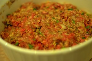 Raise heat to medium-high. Add the ground turkey and sprinkle in ½ teaspoon salt, the chili powder,cumin, pepper and oregano. Work spices into the meat cook until it is crumbled and no longer pink, about 5-7 minutes.